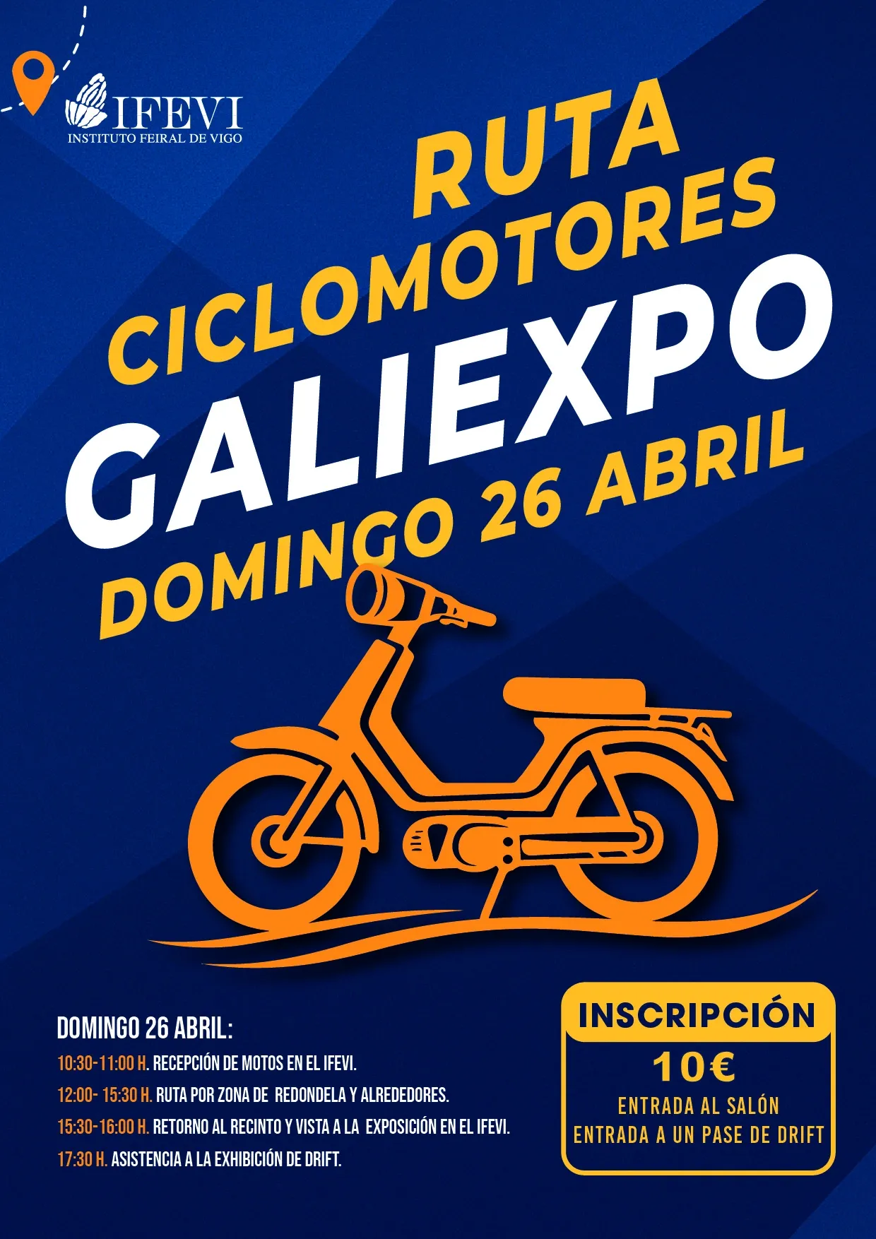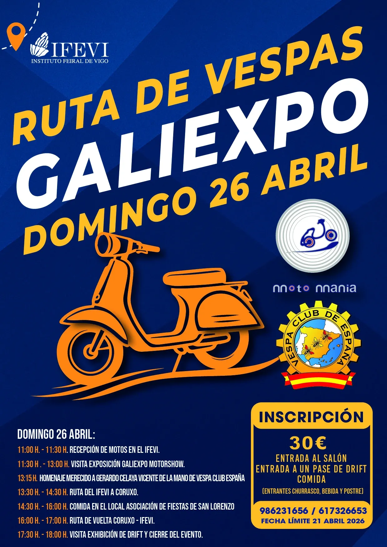 Ruta organizada por Motomanía y el Club de Vespas España que incluye entrada al salón Galiexpo Motor Show, un pase al espectáculo de drift, comida y una ruta por los alrededores.